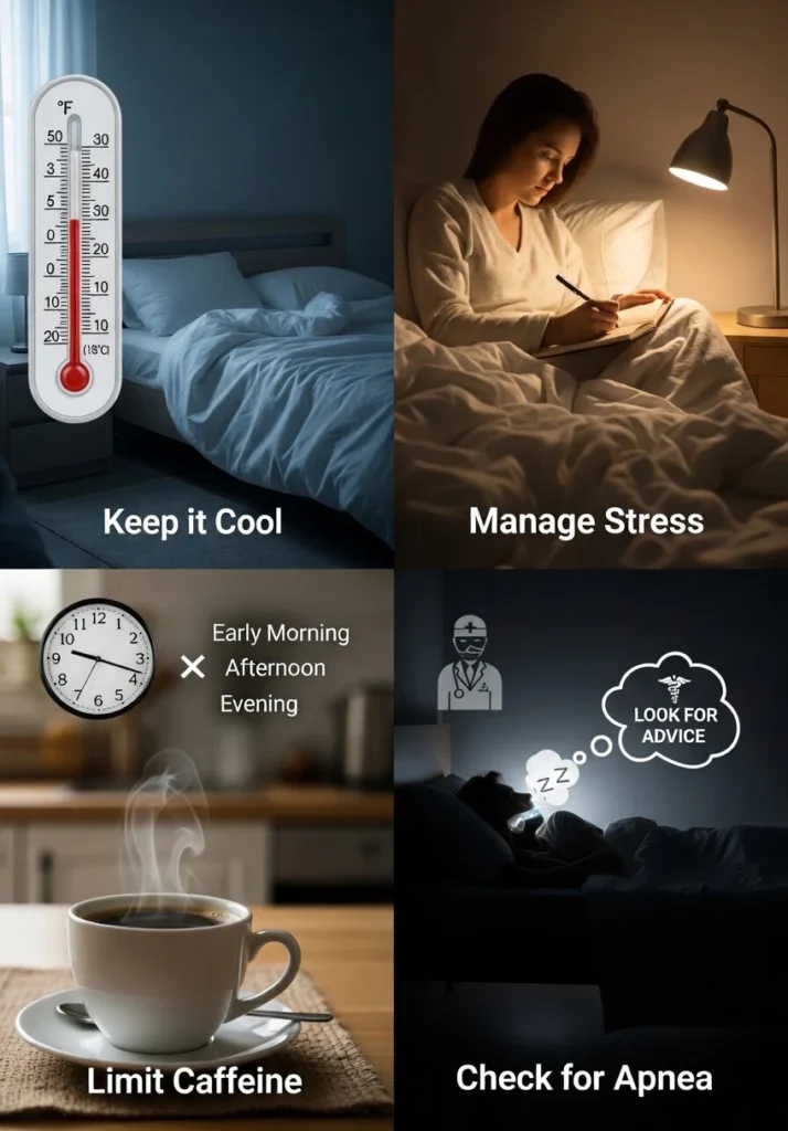 • Limit Caffeine: Avoid coffee at least 8 hours before bedtime.